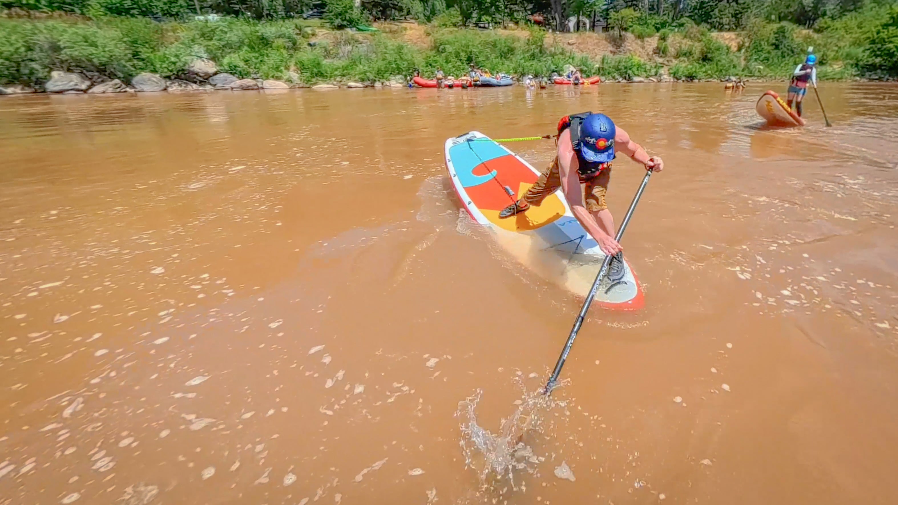 stand-up paddleboarder is navigating a muddy, brown river
