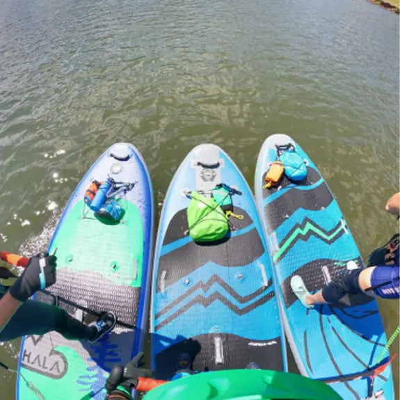 Hala Atcha 9'6 inflatable paddle board full kit in teal, and dark blue. Includes the board, travel bag, hand pump, StompBox retractable fin system, repair kit, and additional fins for versatile river surfing and whitewater performance.Hala Atcha 9'6 inflatable paddle board displayed from multiple angles in teal, and dark blue. Includes top deck with traction pad, bottom view with fin setup and Hala logo, and side profile showing rocker shape and Atcha 9'6 branding.