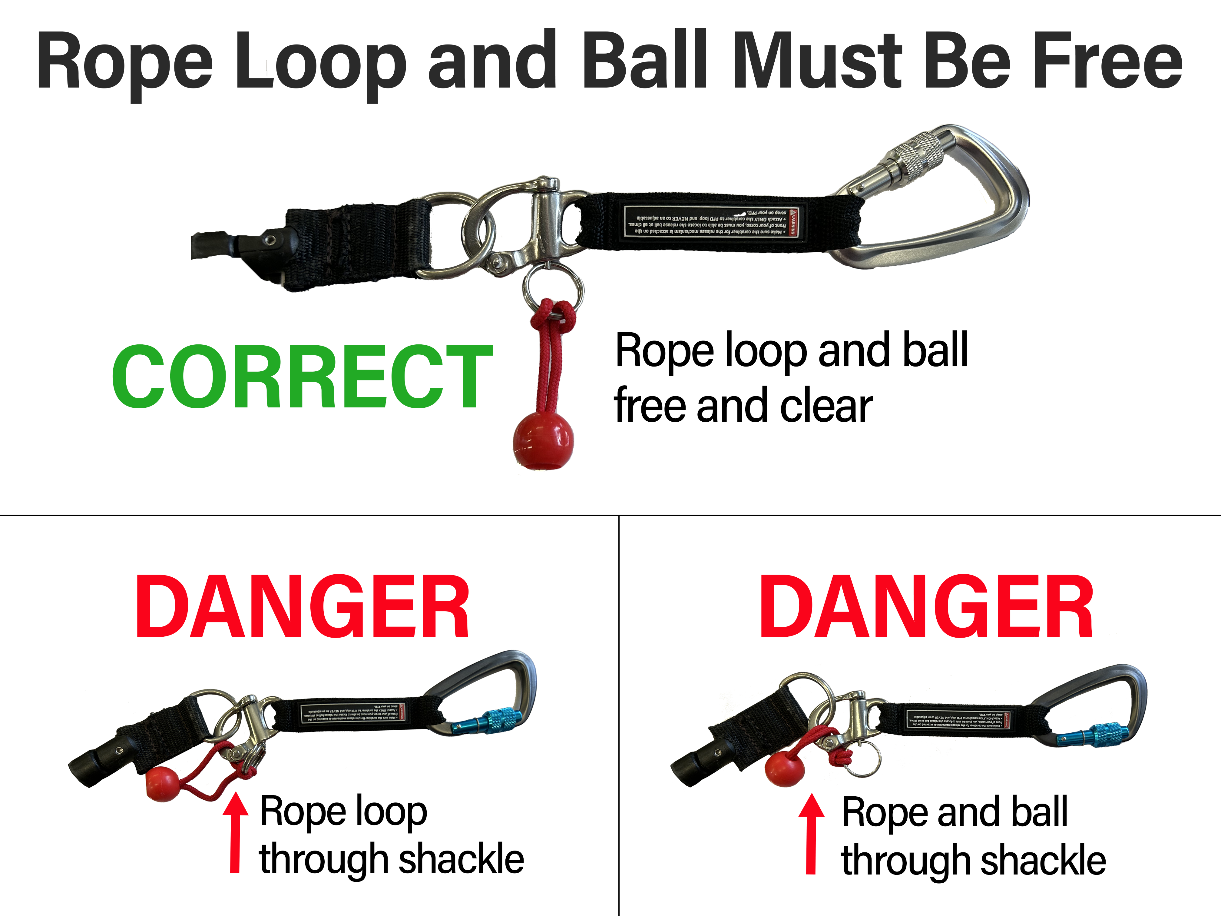 Loop and Ball must be FREE AND CLEAR of the shackle to be useful. If the rope and loop are not hanging freely, the leash will not release properly.