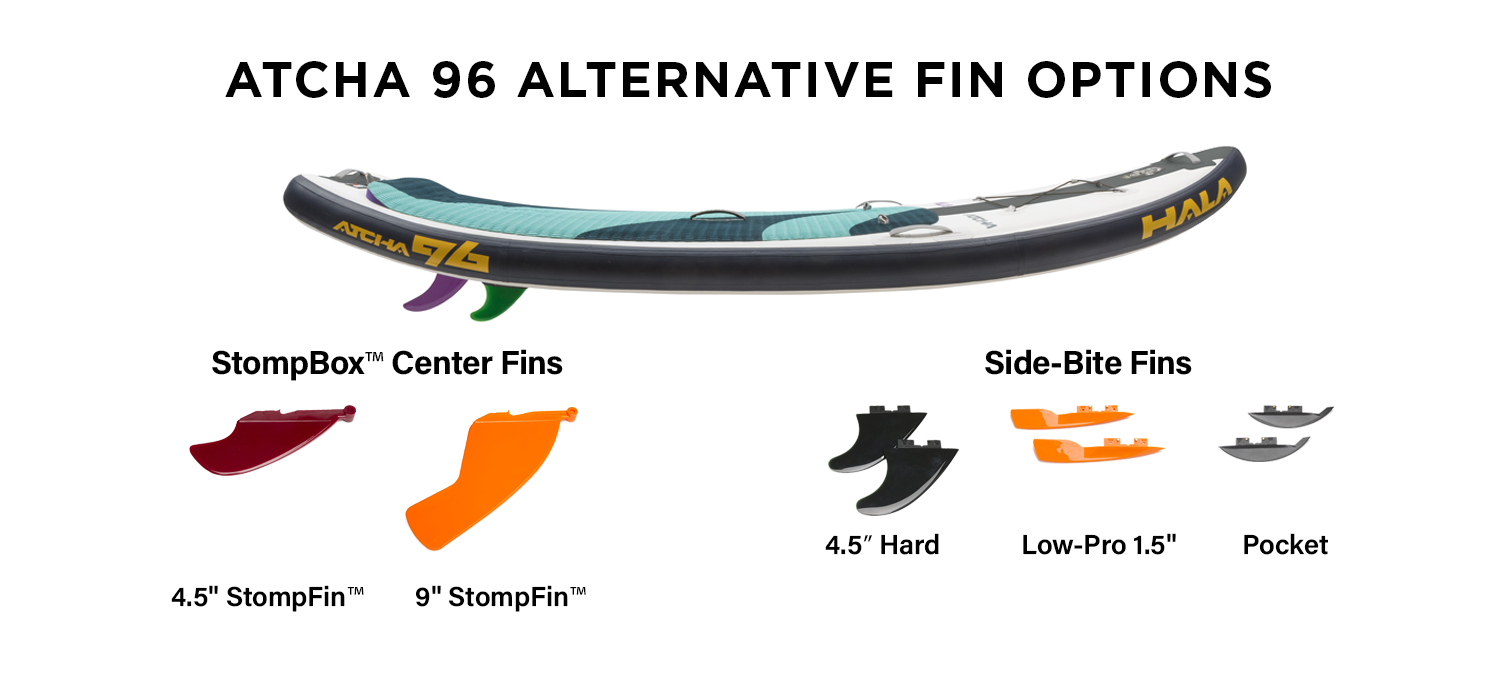 Hala StompBox 2.5 kit installed on the Hala Atcha 9'6 inflatable paddleboard, featuring an automatic retractable fin system for superior performance in shallow and rocky waters.