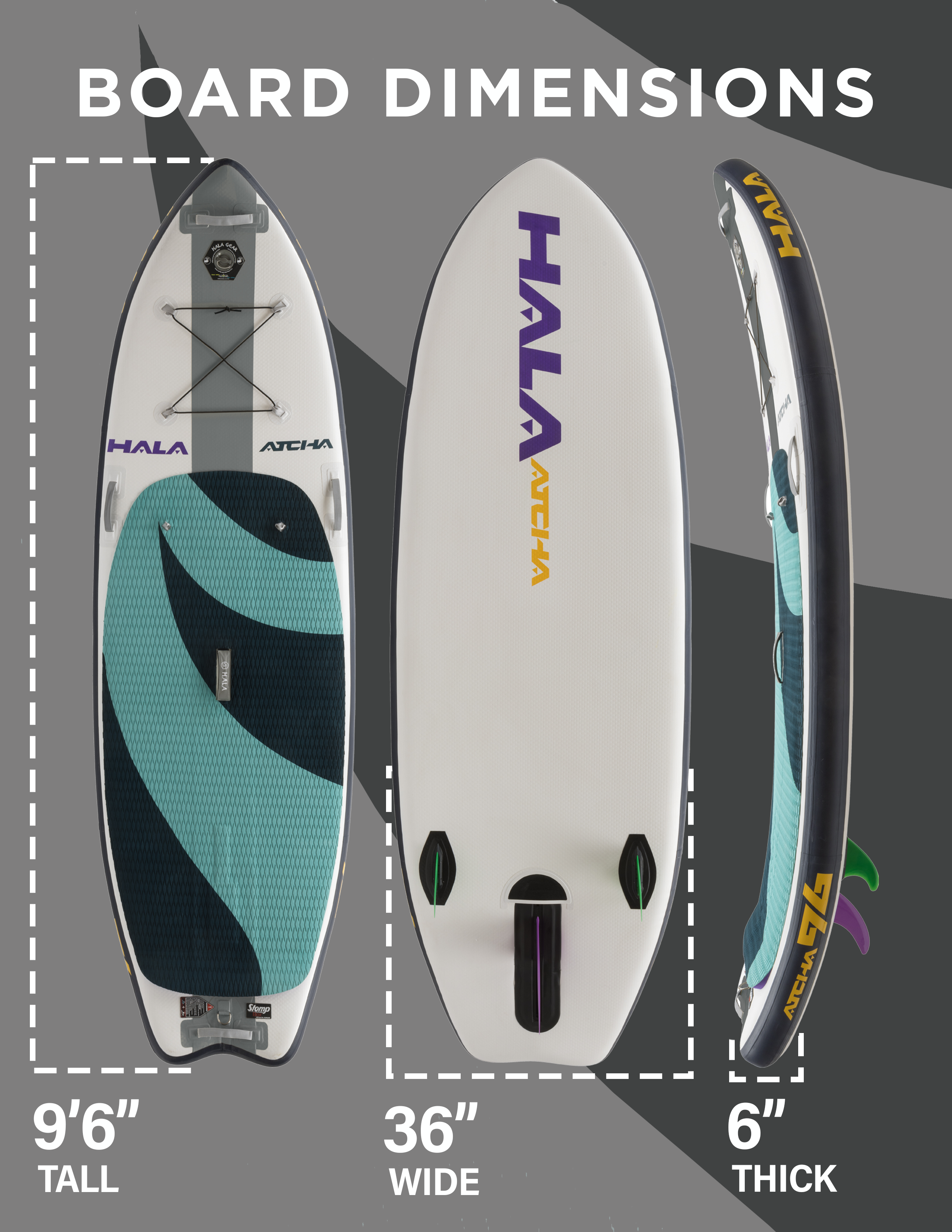 Hala Atcha 9'6 inflatable paddle board full kit in teal, and dark blue. Includes the board, travel bag, hand pump, StompBox retractable fin system, repair kit, and additional fins for versatile river surfing and whitewater performance.