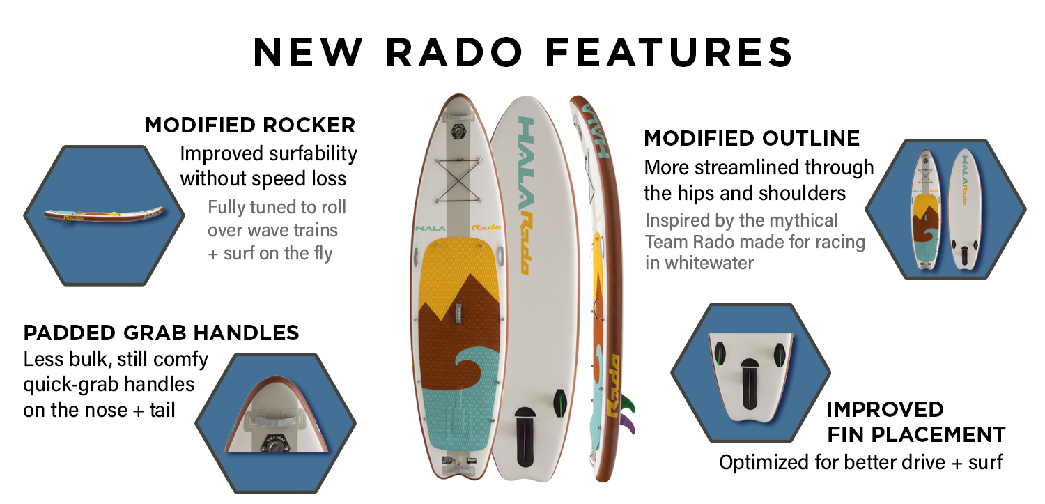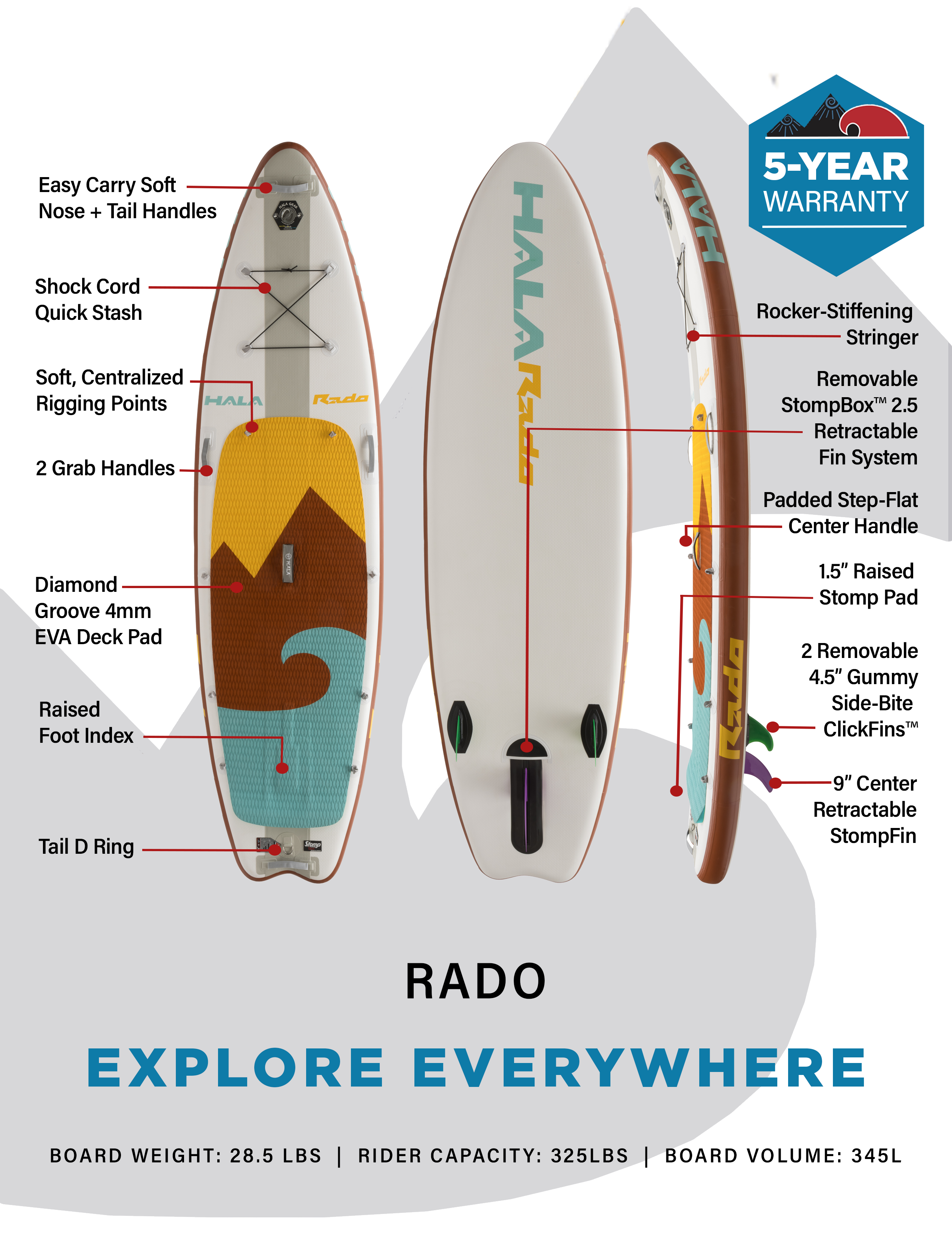 The Epic River and Expedition SUP. The Hala Rado is built for paddlers who want the best of both worlds, whitewater performance and flatwater versatility. Designed for those who split their time between the river and the lake, the Rado provides serious river performance without sacrificing efficiency or stability on calm water.