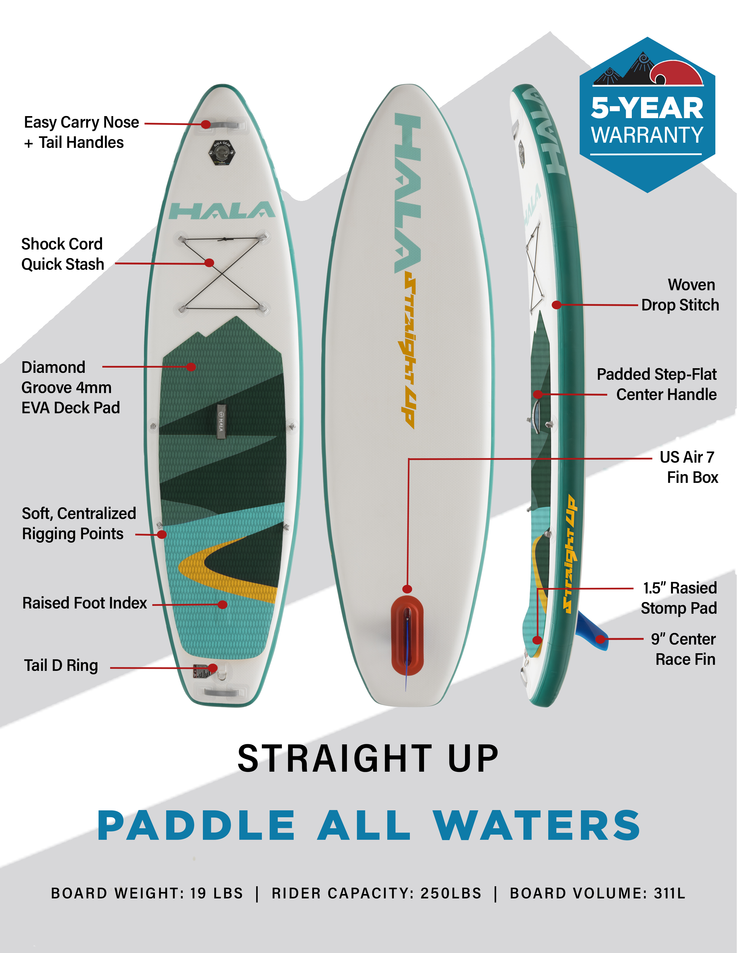 Hala Gear offers an industry-leading 5-year warranty on every SUP. We use quality materials and a unique construction process to create top-of-the-line boards that are built to last.